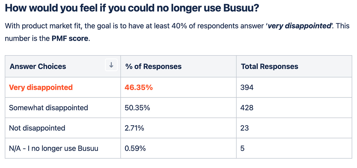 “We found it incredibly useful,” remembers Kirsten. “For one thing, we found we did have product market fit. More than 40% of users would be very disappointed if they could no longer use Busuu. But that survey is also incredibly good at telling you what people value about your product and what they don’t like so much. And that was really crucial.”