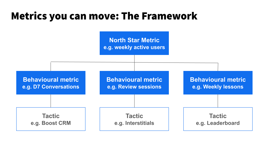 Kirsten says that you need to understand the behavioural metrics that feed up to the North Star and each of these needs to be tied to a set of tactics that inform your product roadmap. Busuu has turned this insight into a framework.