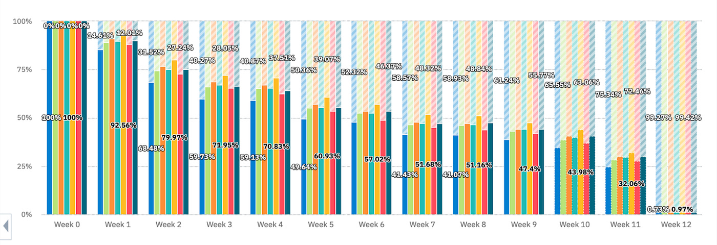 In the process of tracking engaged learners, Bususu learnt an enormous amount about what they call behavioural metrics. They started to look at cohorts who were engaged learners and those who weren’t and identify the differences. They looked at the activities those users had engaged in and whether they became an engaged learner or not. And they found that some of the behaviours had a much stronger impact on retention than others.