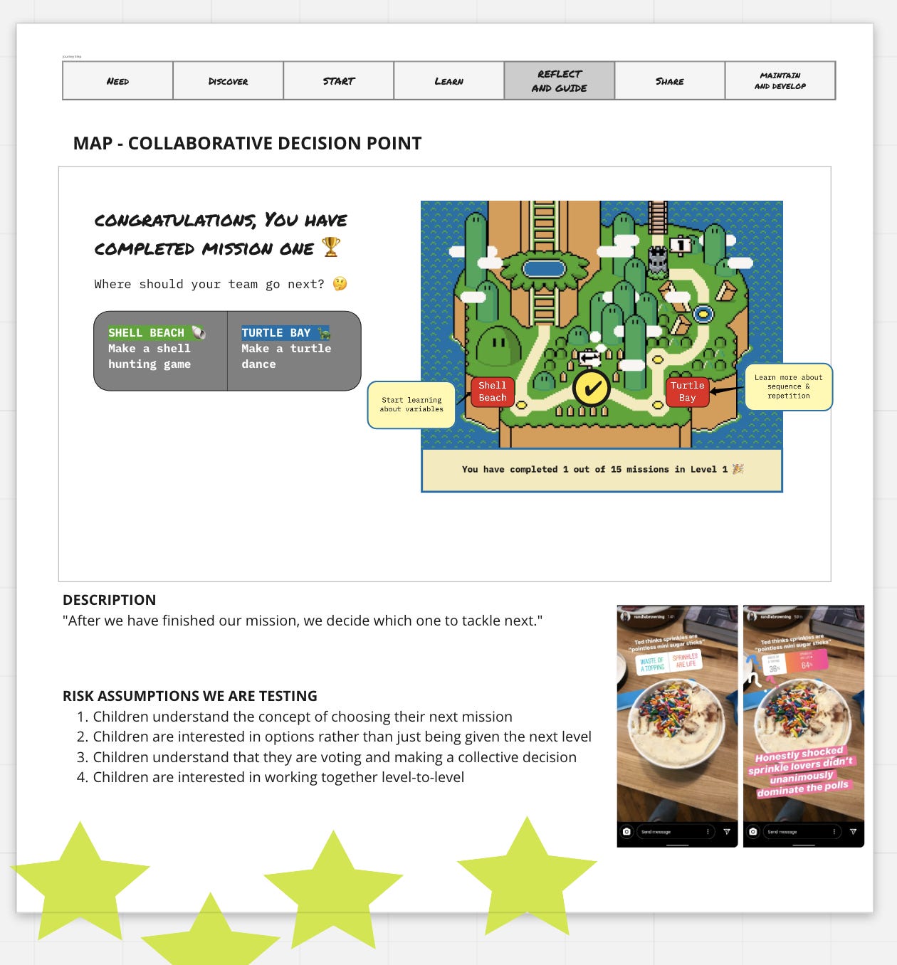 They also decided on some principles to use as constraints. For example, making a mobile-friendly website that works on all devices rather than an app and also that the learning experience would utilise the best of Raspberry Pi Foundation’s constructivist pedagogy so children would learn to code through making stuff.