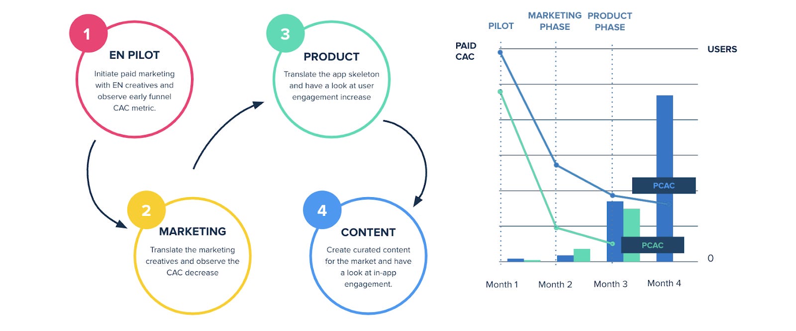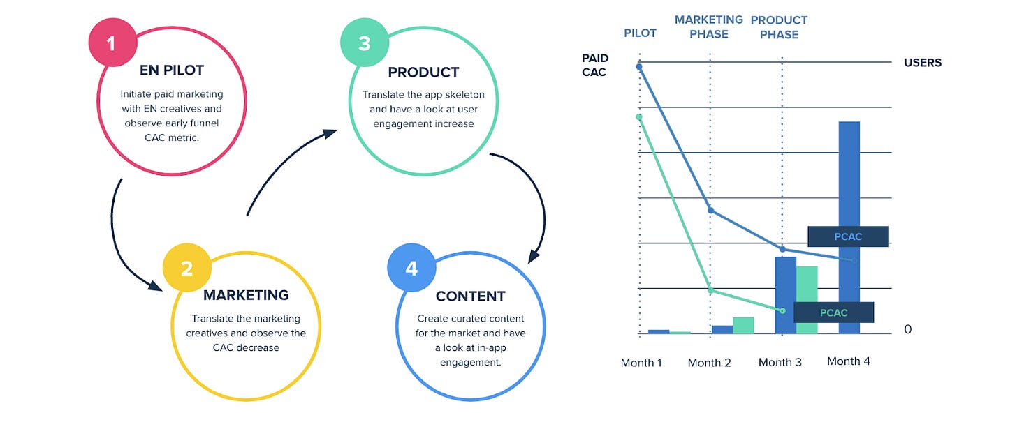 The next piece was to translate the marketing creative and App Store ads to decrease the acquisition costs. And if that was still promising, then they translated the product, which helped improve engagement. The last step was to translate the content.