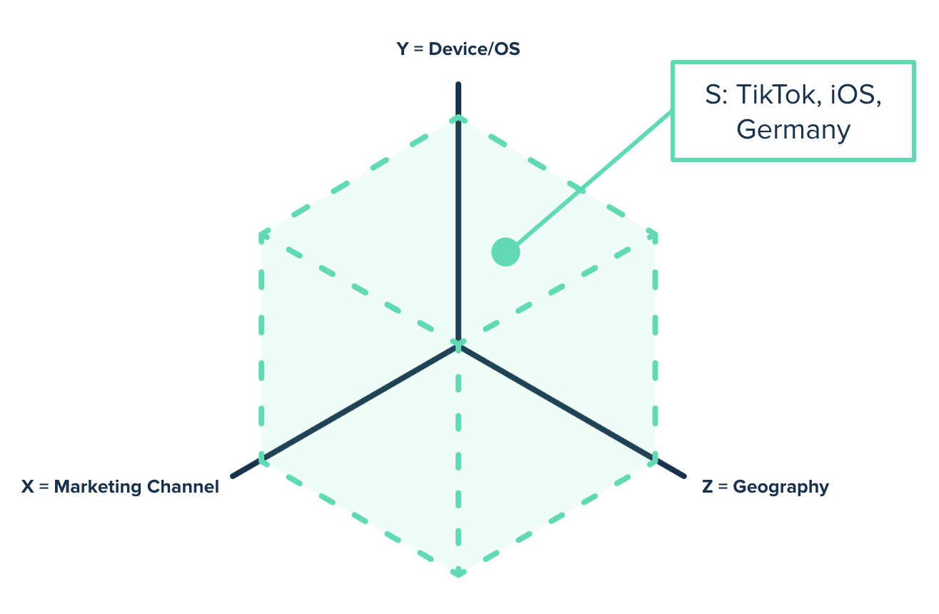 One axis of ‘the cube’ is the channel e.g. TikTok. Another is the device e.g. iOS. The last is the geography e.g. Germany. This allows them to understand the User Value created by every combination of channels.