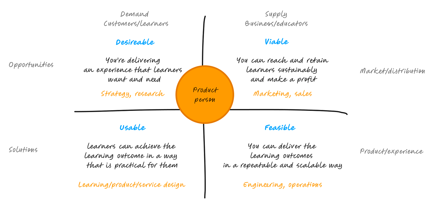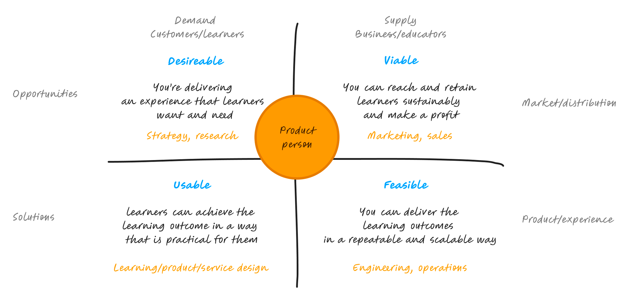 In product-led technology companies, the role of the product manager is typically to focus on the top two: uncovering opportunities for desirable solutions and ensuring that they are viable. They are likely to collaborate with research, strategy, sales and marketing to do this. They work closely with designers and engineers whose focus is the bottom two.