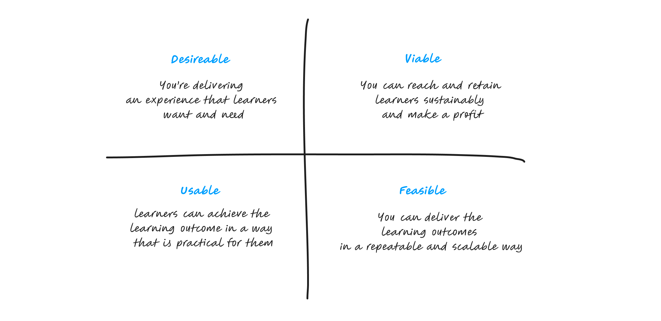This completes this first series on product thinking in learning. Over the last five articles weâve built up a picture of the key concepts behind a product mindset. Here it is brought together onto a single - if busy - 2x2. I hope that this provides an interesting thinking tool.